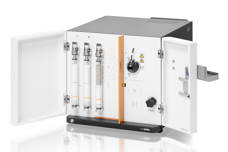 For reliable analysis of carbon and sulfur, the combustion gases must be freed from water vapor prior to IR detection. The CHS-r elemental analyzer has two drying columns filled with magnesium perchlorate to reliably prevent absorption effects in large sample volumes. In the case of TOC analyses, a chemical tube can also be used as a halogen trap to reliably absorb acid residues and halogens.