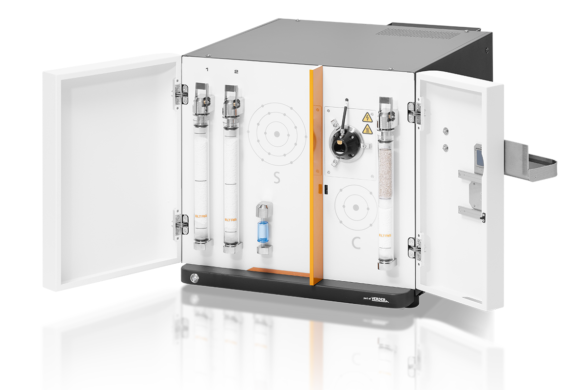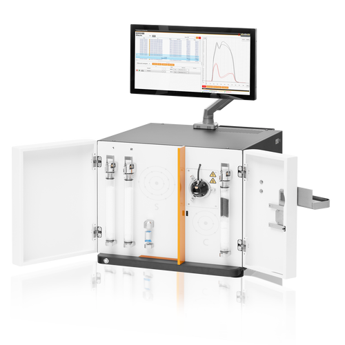 For reliable carbon and sulfur analysis, the combustion gases must be freed from water vapor prior to IR detection. The CS-r elemental analyzer is equipped with two drying columns filled with magnesium perchlorate to reliably prevent absorption effects in large sample volumes. In the case of TOC analysis, a chemical tube can also be used as a halogen trap to reliably absorb acid residues and halogens.