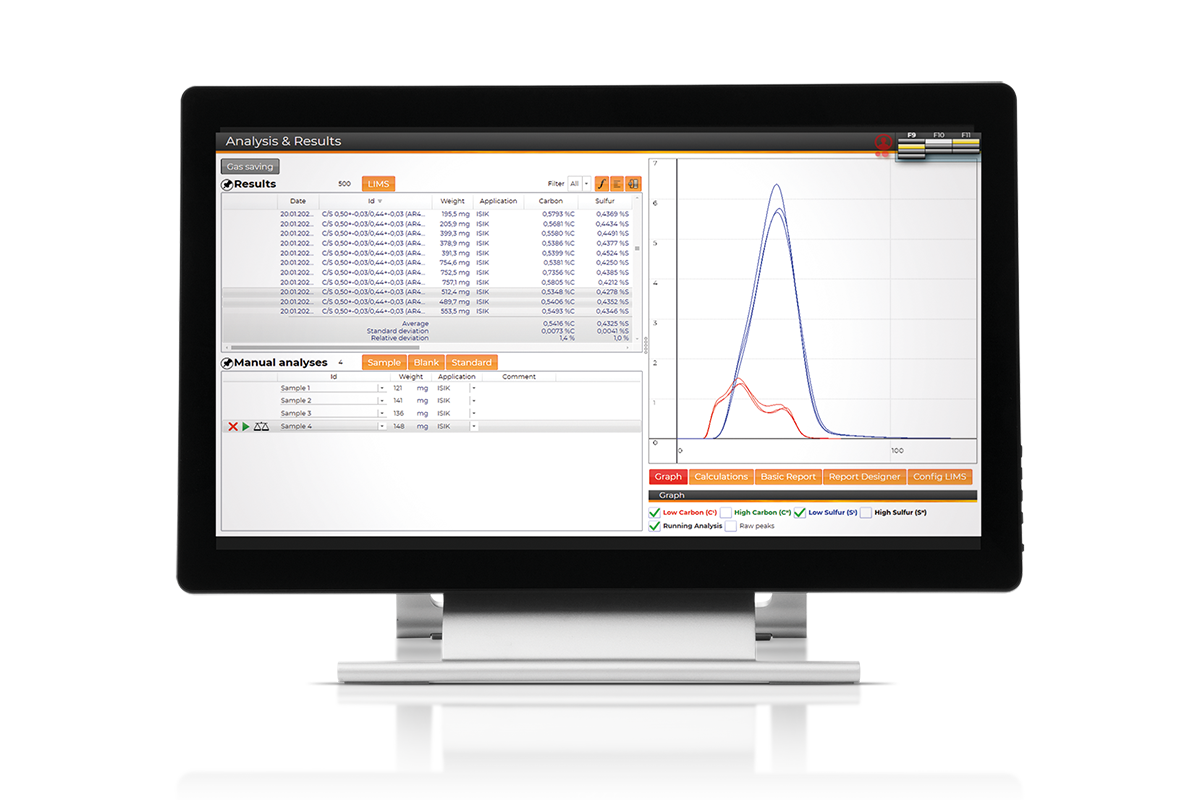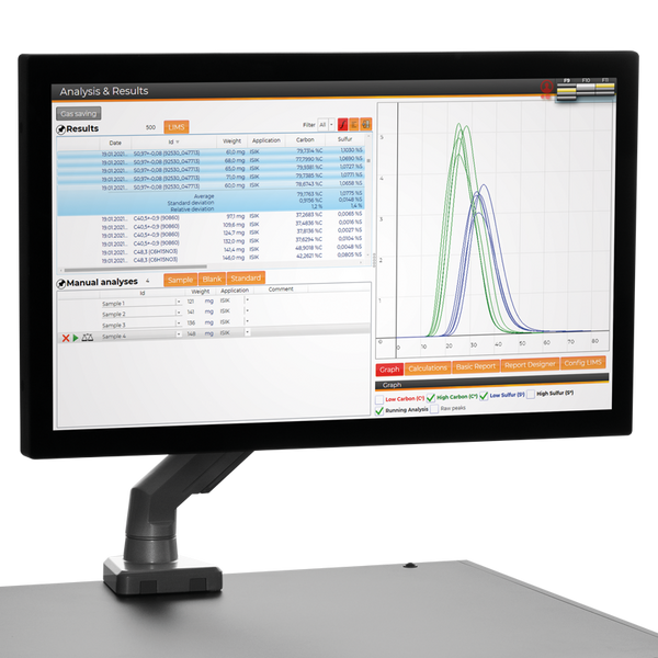 60 to 240 seconds after the analysis has started, the measured carbon and sulfur concentrations are available for export as a report or via LIMS. Depending on the selected configuration, carbon and sulfur values are available for the individual sample.