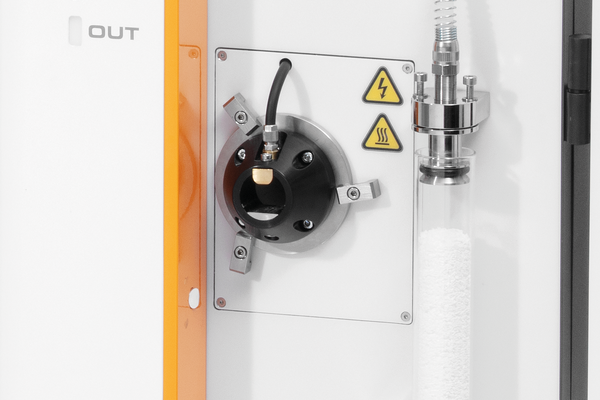 Whereas the induction furnace of the ELEMENTRAC CS-d is suitable for analyzing inorganic samples like steel, cast iron and ceramics, the resistance furnace is used for combustion of organic samples like coal, coke or soil. When a coal sample is combusted at temperatures of approx. 1350° C, CO2 and SO2 are released but usually no carbon monoxide (CO) is formed. The combustion gases of the resistance furnace first pass a ceramic filter for absorption of particles, followed by a glass tube with magnesium perchlorate.